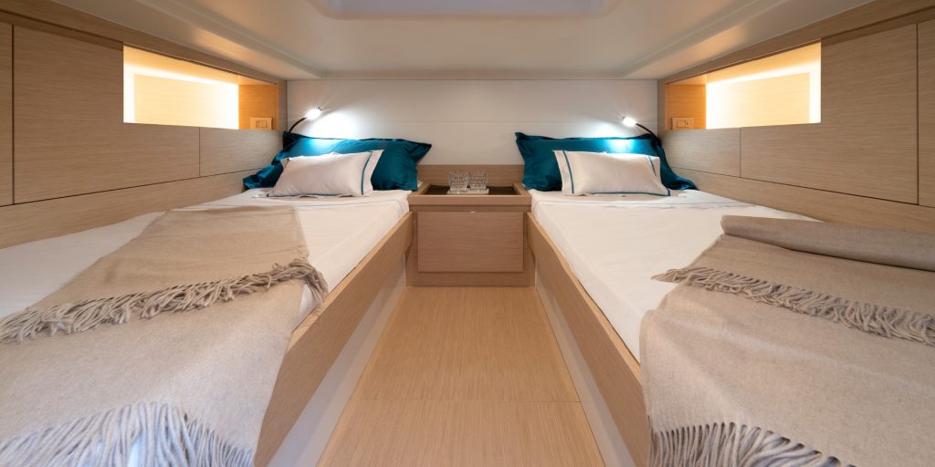 Un camarote principal espacioso y excepcionalmente cómodo El camarote principal ofrece un espacio y un confort impresionantes, con un tamaño de cama que rivaliza con los que suelen encontrarse en yates mucho mayores.