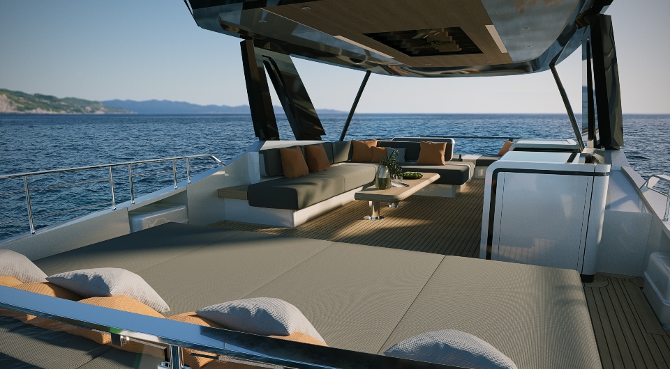 - Flybridge multifuncional: Con una extensión de 40 m2, incluye tres áreas de estar: un solárium para cuatro personas, una mesa de comedor para ocho comensales y otro solárium frente al puesto de conducción.